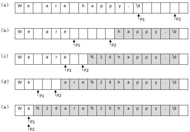 请实现一个函数,将一个字符串中的每个空格替换成“%20”。例如,当字符串为"We Are Happy".则经过替换之后的字符串为"We%20Are%20Happy"。