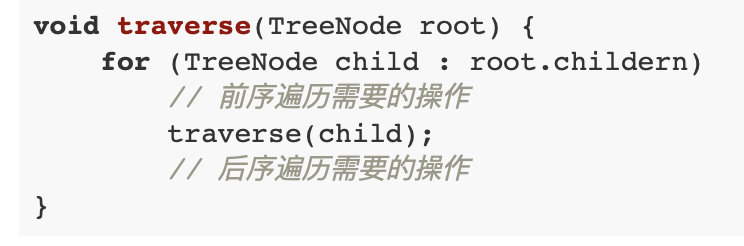前序遍历的代码在进入某一个节点之前的那个时间点执行,后序遍历代码在离开某个节点之后的那个时间点执行。