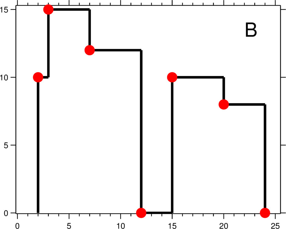 输出是以 [ [x1,y1], [x2, y2], [x3, y3], ... ] 格式的“关键点”(图B中的红点)的列表,它们唯一地定义了天际线。关键点是水平线段的左端点。请注意,最右侧建筑物的最后一个关键点仅用于标记天际线的终点,并始终为零高度。此外,任何两个相邻建筑物之间的地面都应被视为天际线轮廓的一部分。