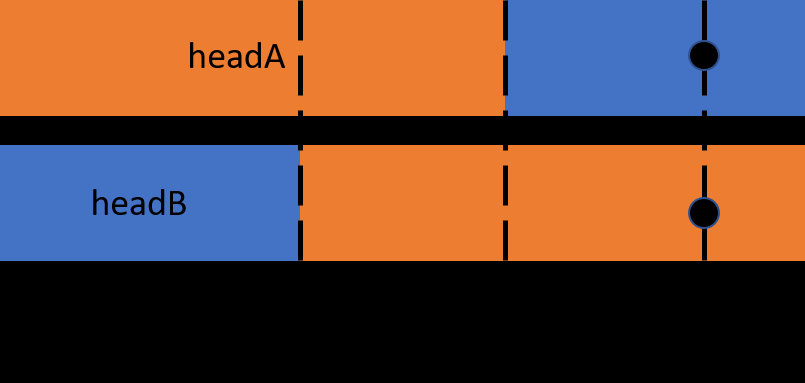 非常巧妙的解法,headA跑完了到 headB的头,headB跑完了到 headA的头。相当于做了a+b和b+a的两个链表。