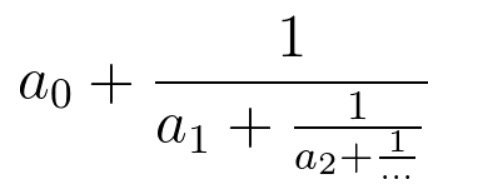 输入的cont代表连分数的系数(cont[0]代表上图的a0,以此类推)。返回一个长度为2的数组[n, m],使得连分数的值等于n / m,且n, m最大公约数为1。