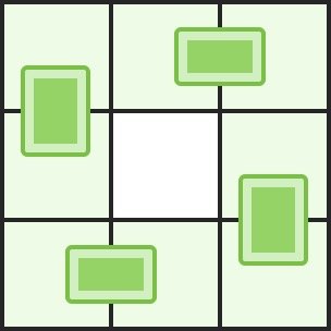输入:n = 3, m = 3, broken = [] 输出:4 解释:下图是其中一种可行的摆放方式